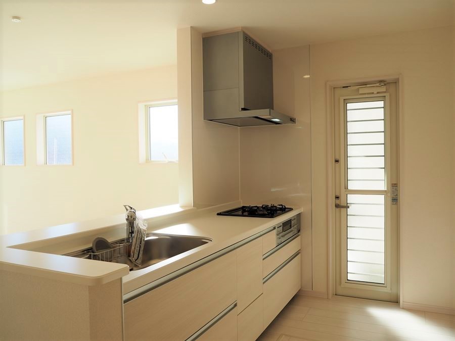 料理をしながらリビングがしっかり見渡せます。勝手口付きなのも嬉しいですね。