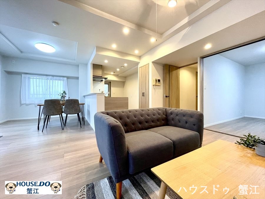 約20.5帖の広さがあるフローリングのLDK。奥の6.4帖洋室を含めると26.9帖の開放的な空間になります。