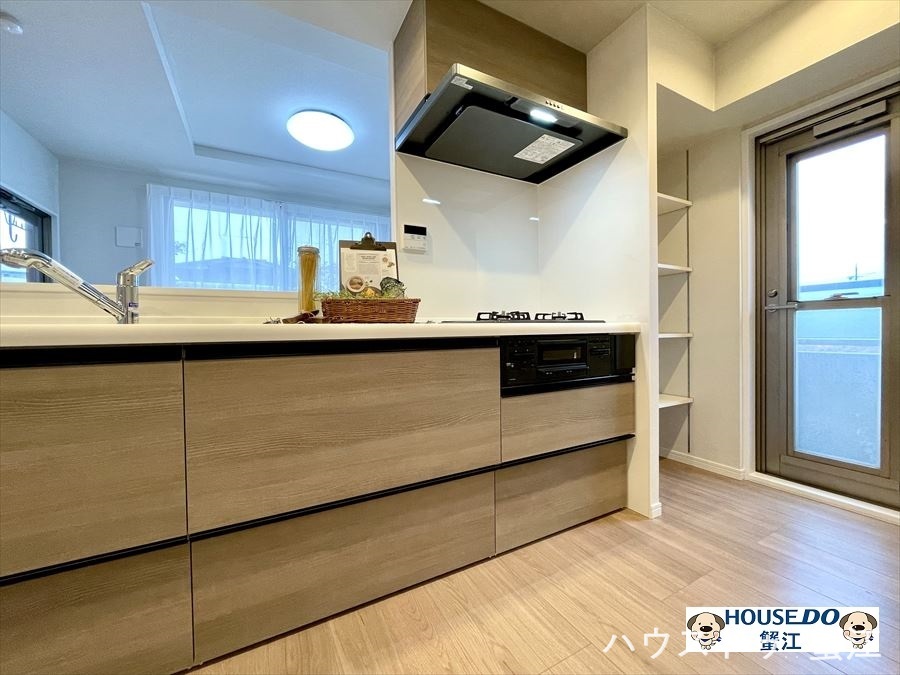 コンロ横には収納棚が設えられており、パントリーしてもお使い頂けます。