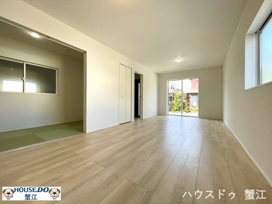 17.5帖の広さがある直線型LDK。横のタタミコーナーを含めると21.5帖の広さがあります。