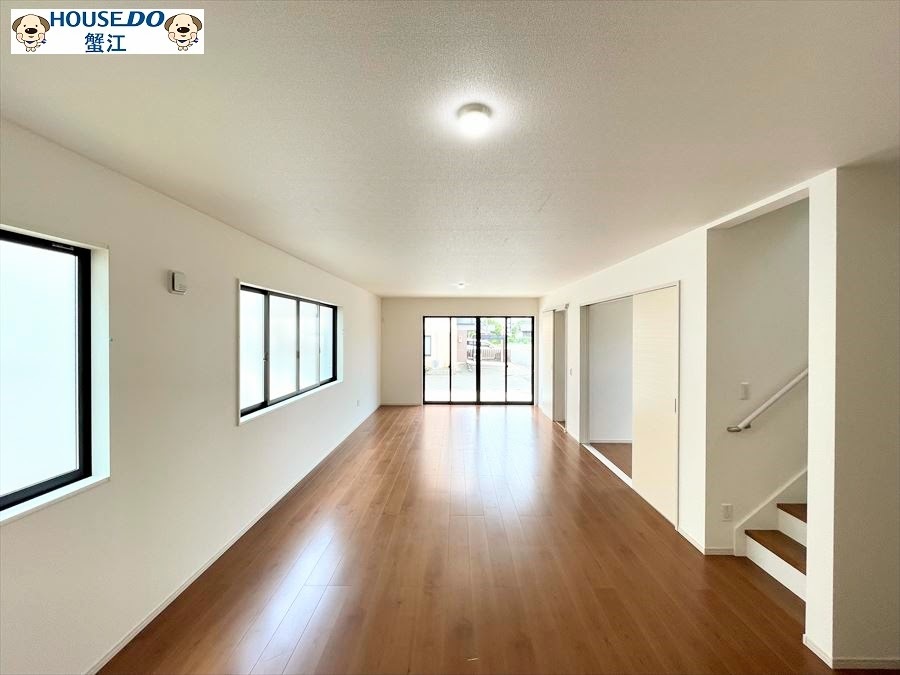 明り取りの窓が多く配置された明るい22.9帖のリビング。フロア中央にはリビング階段があり、家族の会話も弾みます。