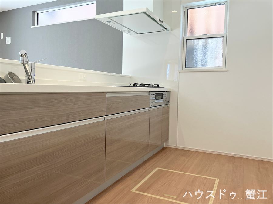 作業スペースも広く使いやすいシステムキッチン。収納もあるので便利です。