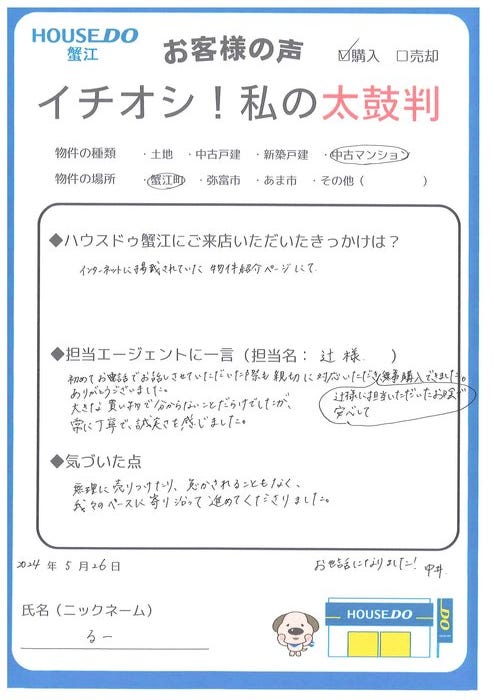 るー様。この度はご成約おめでとうございます!不動産購入は一生に一度の大きな買い物と言われます。決断するには不安を解消しないと購入できませんので、るー様ご家族が不安なくご希望されたお家を購入するお手伝いができたこと、大変嬉しく思っております。また、このようなお言葉を頂き、今後の励みにもなります。ありがとうございます。