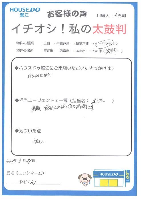 たかくん様。この度はご成約おめでとうございます。ご売却のお手伝いができたこと、大変嬉しく思っております。お引渡しまで、引き続きよろしくお願いいたします。
