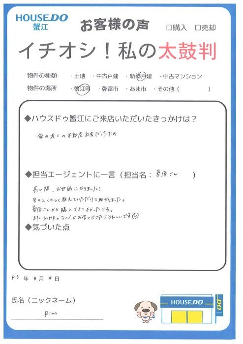 Rina様。この度はご成約おめでとうございます!1年前からお家探しのお手伝いをさせて頂いており、今回Rina様ご家族のご希望にあったお家を購入して頂けたこと、本当に嬉しく思っております。これからもたくさん笑顔の溢れる時間を新しいお家ですごしていただけたらと、心から願っております。このご縁を大切にしたいと思っております。今後も引き続きハウスドゥ蟹江をよろしくお願いいたします。