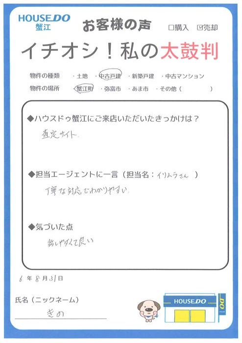 きの様。この度はご成約おめでとうございます。早期売却のお手伝いができたこと、大変嬉しく思っております。弊社を仲介に選んで頂き、ありがとうございました。今後も何かございましたら、お気軽にお声がけください。
