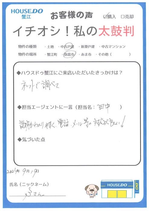る様。この度はご成約おめでとうございます!また、数ある不動産会社の中から弊社を選んでいただき、大変嬉しく思っております。今後もハウスドゥ蟹江をよろしくお願いいたします。