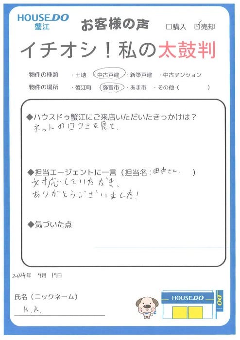 k・k様。この度はご成約おめでとうございます。早期売却のお手伝いができたこと、大変嬉しく思っております。弊社を仲介に選んで頂き、ありがとうございました。今後も何かございましたら、お気軽にお声がけください。