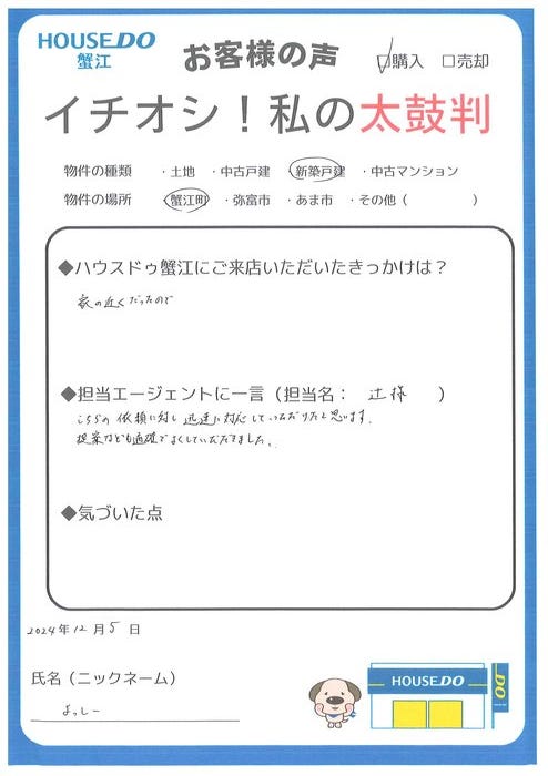 この度はご成約おめでとうございます。未完成物件でのご契約だったため、お引渡しまで期間が空きましたが、カラーセレクトなどよっしー様のご希望が反映されるお家になったのが良かったと思います。新しいお家で新年を迎えられることになり、大変嬉しく思っております。素敵な日々をお過ごしください!