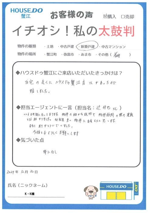 K・K様のお家探しのお手伝いをさせて頂き嬉しく思っております。