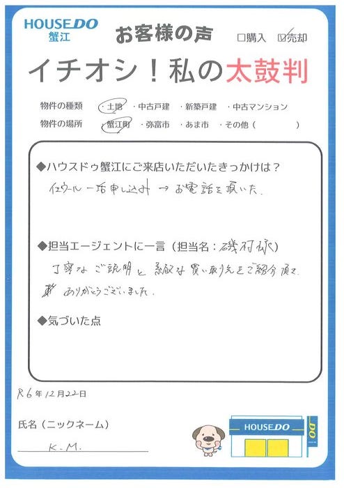 K・M様。この度はご成約おめでとうございます。早期売却のお手伝いができたこと、大変嬉しく思っております。数ある不動産会社の中から選んで頂き、ありがとうございました。今後も何かございましたら、お気軽にお声がけください。