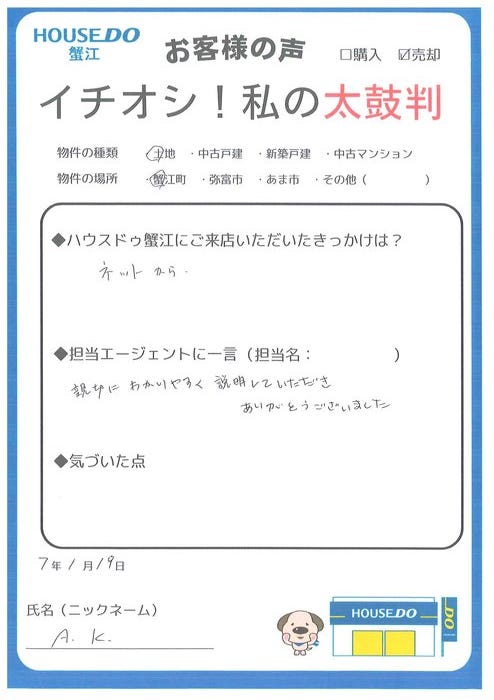 A・K様。この度はご成約おめでとうございます。早期売却のお手伝いができたこと、大変嬉しく思っております。数ある不動産会社の中から選んで頂き、ありがとうございました。今後も何かございましたら、お気軽にお声がけください。