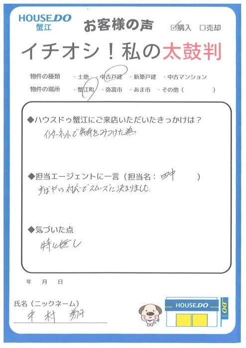 この度はご成約おめでとうございます。また、アンケートにご協力いただきありがとうございました。今後の励みにさせて頂きます。また、何かございましたら、いつでもお声掛けください。今後もハウスドゥ蟹江をよろしくお願いいたします。
