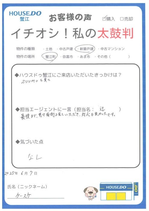 ケースケ様。この度はご成約おめでとうございます!また、数ある不動産会社の中から弊社を選んでいただき、大変嬉しく思っております。今後も丁寧な対応を心掛けて、努めてまいります。新しいお家で素敵な時間をお過ごしいただけることを心から願っております。