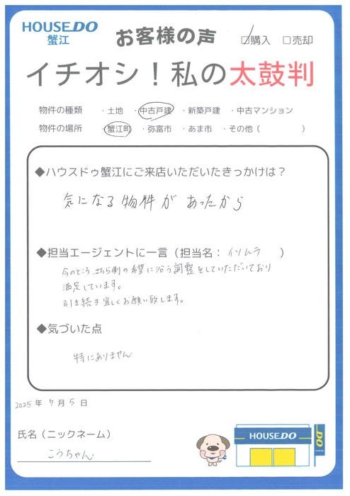 こうちゃん様。この度はご成約おめでとうございます!また、数ある不動産会社の中から弊社を選んでいただき、大変嬉しく思っております。今後も丁寧な対応を心掛けて、努めてまいります。新しいお家で素敵な時間をお過ごしいただけることを心から願っております。