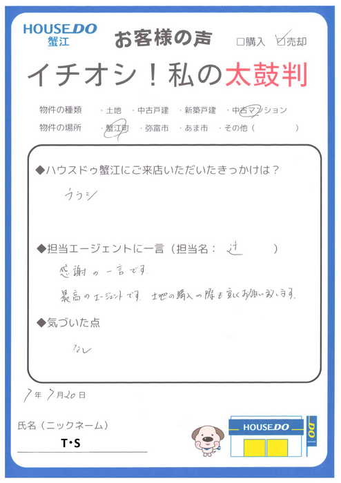 T・S様。この度はご成約おめでとうございます。売却のお手伝いができたこと、大変嬉しく思っております。弊社を仲介に選んで頂き、ありがとうございました。今後も何かございましたら、お気軽にお声がけください。
