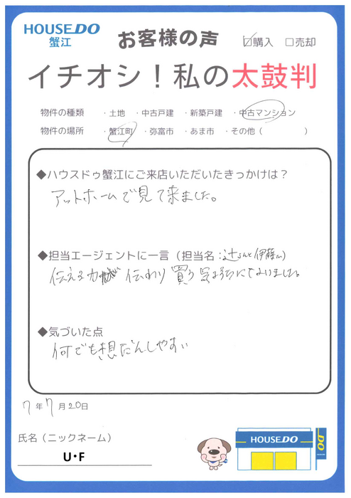 U・F様。この度はご成約おめでとうございます!また、数ある不動産会社の中から弊社を選んでいただき、大変嬉しく思っております。素敵な毎日が訪れることを心より願っております。今後もハウスドゥ蟹江をよろしくお願いいたします。