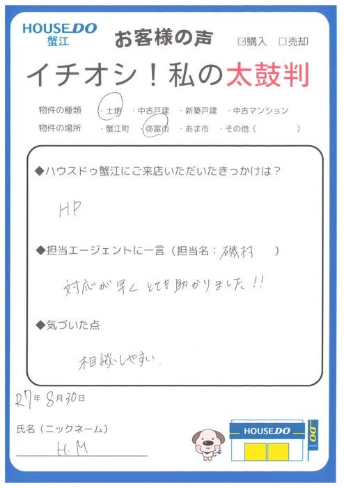 H・M様。この度はご成約おめでとうございます!また、数ある不動産会社の中から弊社を選んでいただき、大変嬉しく思っております。素敵な毎日が訪れることを心より願っております。今後もハウスドゥ蟹江をよろしくお願い致します。