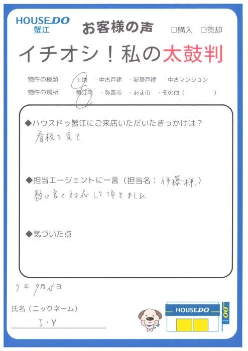 I・Y様。この度はご成約おめでとうございます。早期売却のお手伝いができたこと、大変嬉しく思っております。数ある不動産会社の中から選んで頂き、ありがとうございました。今後も何かございましたら、お気軽にお声がけください。
