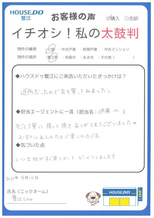 蟹江Love様のお家探しのお手伝いをさせて頂き嬉しく思っております。