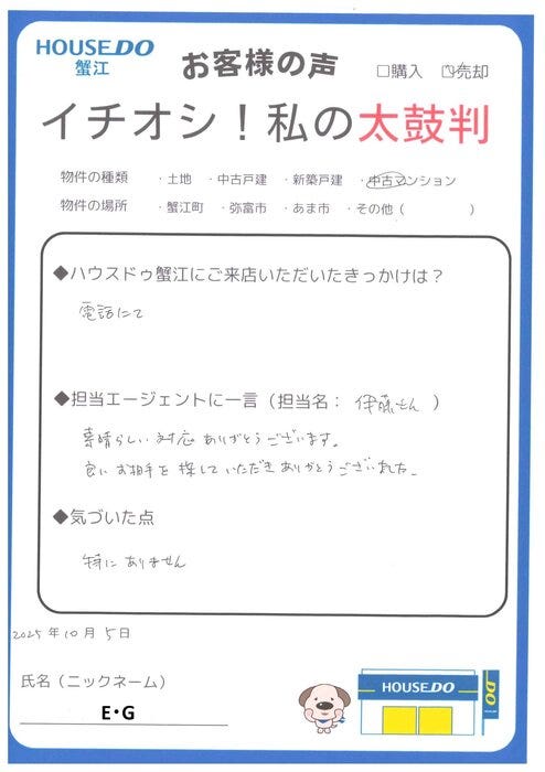 E・G様。この度はご成約おめでとうございます。早期売却のお手伝いができたこと、大変嬉しく思っております。数ある不動産会社の中から選んで頂き、ありがとうございました。今後も何かございましたら、お気軽にお声がけください。